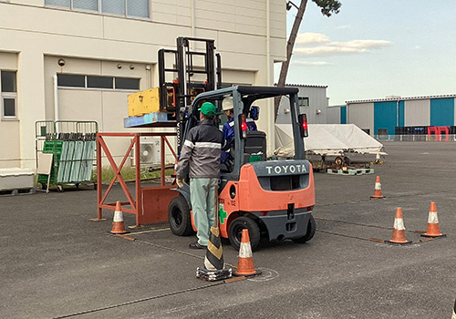 この講習は、一般的に"フォークリフト免許"と呼ばれている資格の正式名称で、航空貨物を取り扱う貨物上屋での作業に欠かせない重要な資格です。空港エンジニア科では、積載量1t以上の運転ができる「フォークリフト運転技能講習」の取得をめざしています。