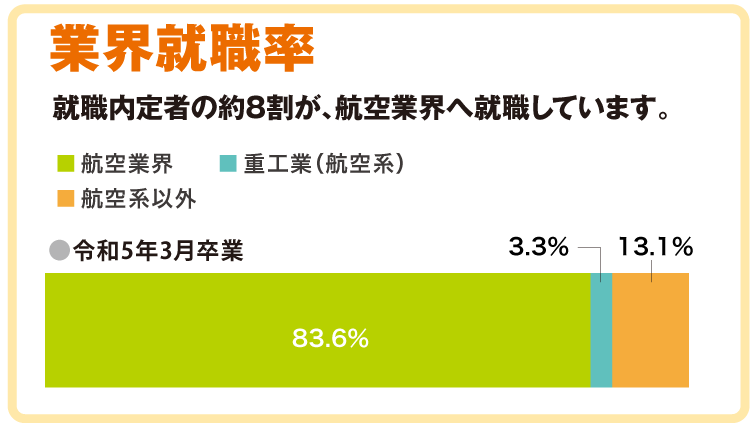 就職担当のスタッフによる親身なアドバイスや、航空業界で活躍してきた教員による実践的な指導で、学生の就職活動を強力にサポート。創立以来蓄積されてきた企業データの活用や、年間を通して本校で行われる校内企業説明会、企業訪問・見学など、航空業界が求める人材像や最新の動向などを、企業の担当者や本校のOB・OGから直接聞くことができます。また、就職実績がある企業はもちろんのこと、新たな求人開拓を進めることで、4年連続100%という高い就職内定実績を達成しています。