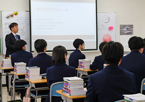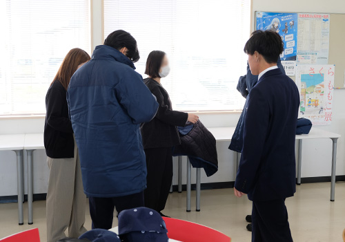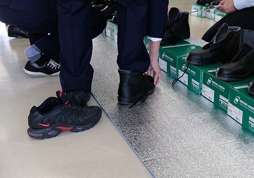 また、航空機整備科と空港エンジニア科では、実習着や安全靴の採寸も行いました。冬の時期に厚着をすることも想定して、どのサイズが自分の身体に合っているのか選びました。5月の連休明けごろ手元に届く予定なので、楽しみですね。