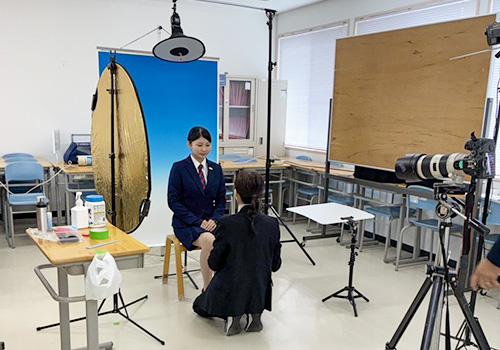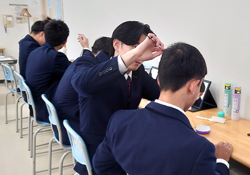 撮影前に、写真スタジオの方から髪型や制服の着こなしについて丁寧なレクチャーを受け、学生同士で身だしなみチェックを行いました。