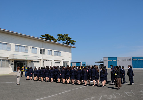 学生たちは教員の誘導に従い、走らず落ち着いて各教室から体育館前まで避難しました。新入生にとっては初めての避難訓練でしたが、先輩たちも含め迅速に避難できていました。