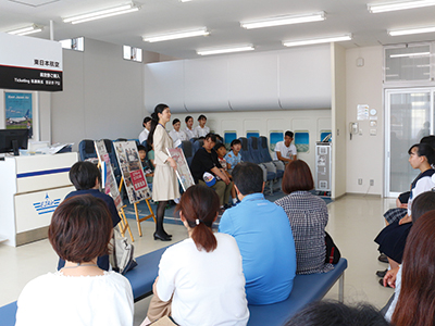 空港カウンターを再現した「エアポート実習室」でグランドスタッフの仕事を体験。接客マナーやアナウンスも実践してみよう。